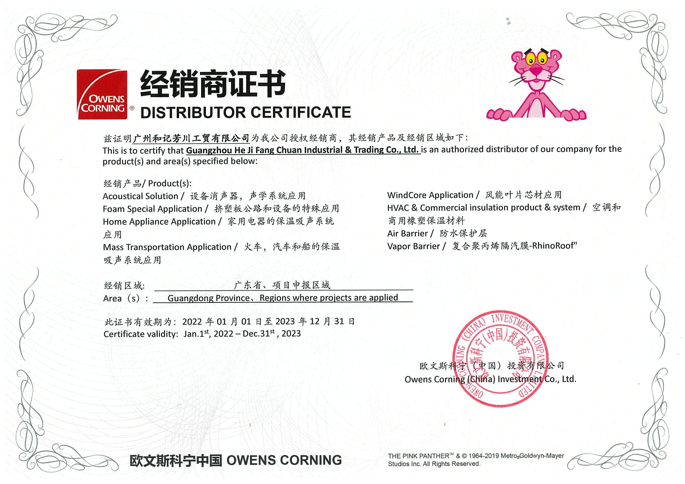 1998年廣州和記芳川工貿有限公司獲得國際品牌"歐文斯科寧"的一級代理商以及OEM加工工廠,2011年在佛山嘉洲大轉灣裝飾市場開設形象經營部,為華南地區裝飾市場和家電制造公司提供優質的加工服務。多年來公司憑借優質的產品、一流的服務贏得了廣大客戶的信賴。